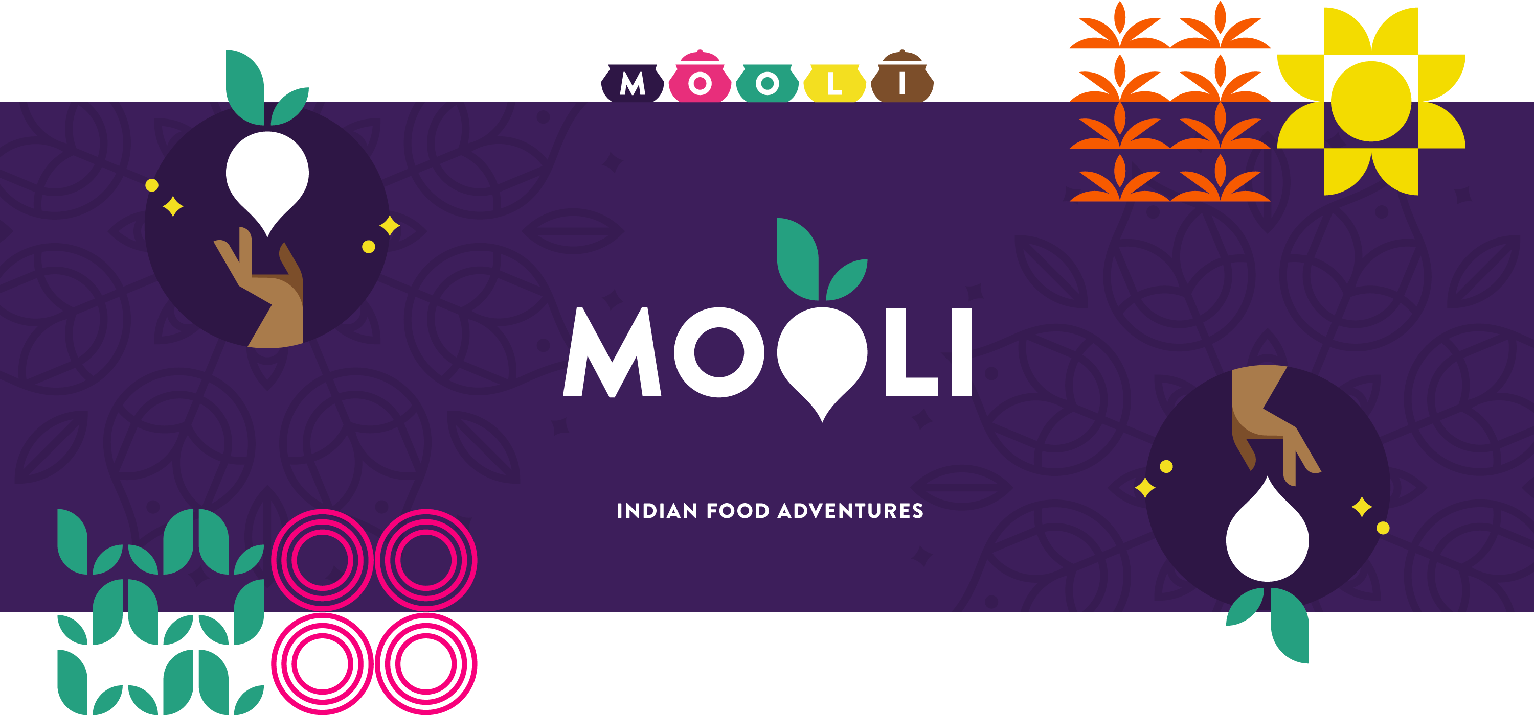 When we tackled the brand, she wanted to ditch the overplayed, stereotypical visuals representing India for patterns and colors that are actually inspired by different regions and traditions. We developed a bright and playful color palette, fun illustrations and cheeky expressions and visuals to bring the aesthetic into modern day.